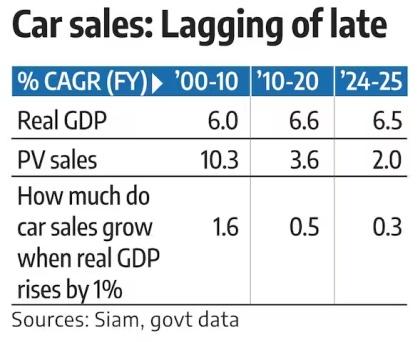 Between 2010-2011 and 2019-2020, GDP CAGR rose slightly to 6.6 per cent, but PV sales slowed to 3.6 per cent. In FY25, PV sales grew just 2 per cent, even as GDP expanded by 6.5 per cent.