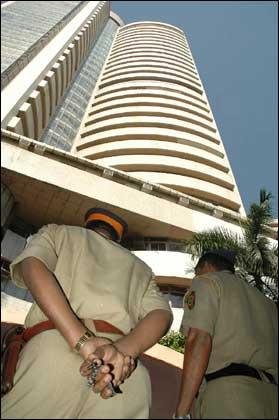 (Left) Cops at the Bombay Stock Exchange building on November 17 after receiving information that a bomb had been kept there. The alert had been a hoax.