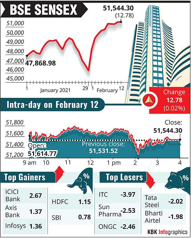 The 30-share BSE Sensex gyrated 543.96 points before closing 12.78 points or 0.02 per cent higher at its new closing record of 51,544.30.