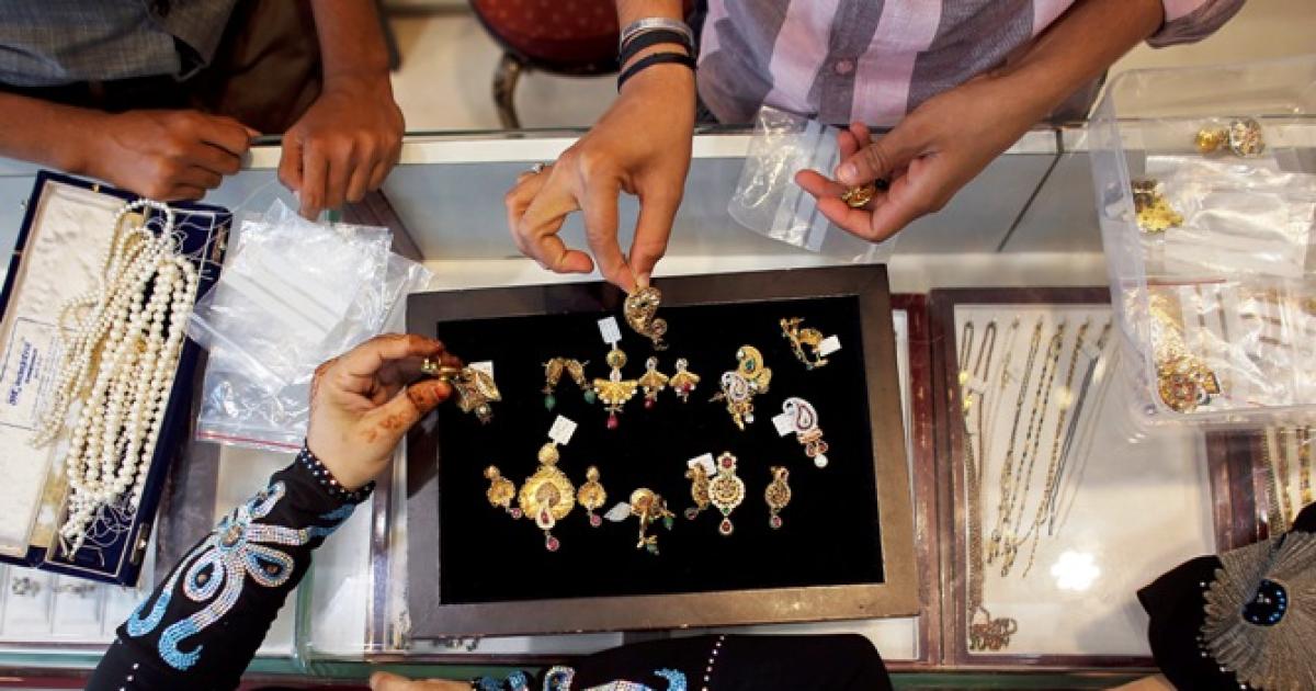 Image: A customer looks at a gold pendent inside a jewellery showroom in Mumbai. Photograph: Danish Siddiqui/Reuters