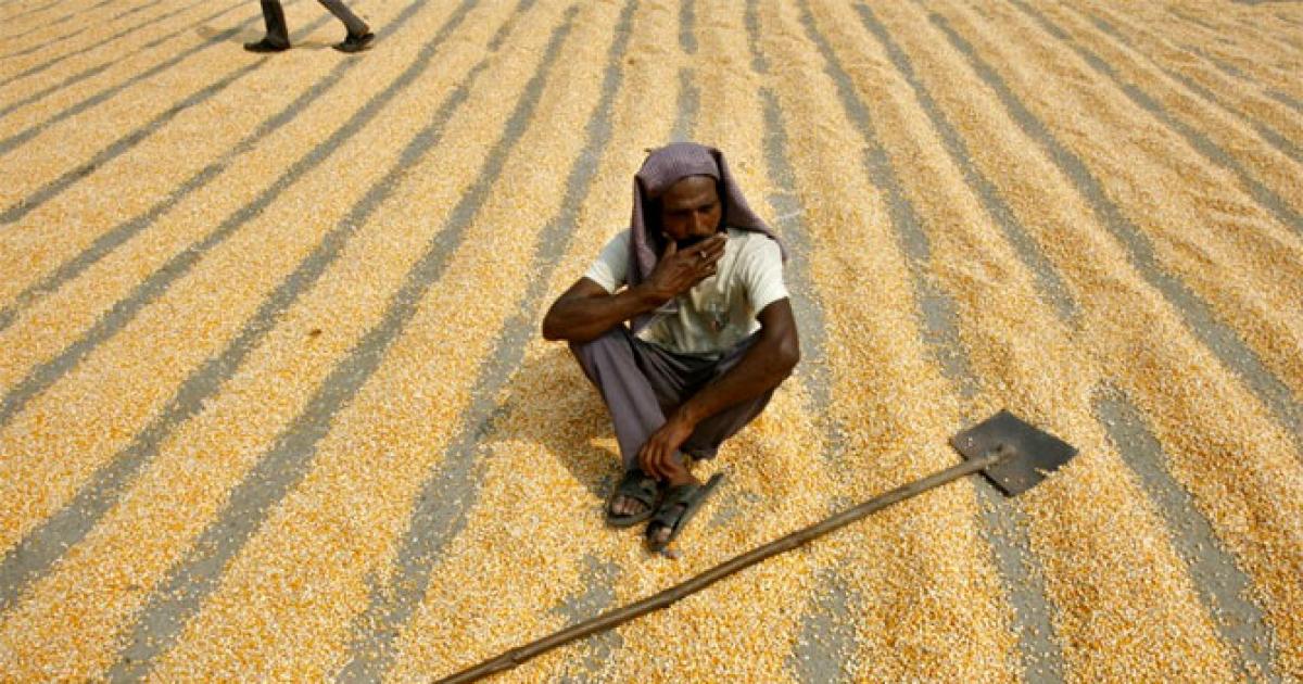 Image: A labourer smokes while taking a break from spreading maize crop to dry at a wholesale grain market in Chandigarh. Photograph: Reuters.