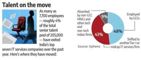 Of these, 43 per cent joined another Tier-I or mid-tier IT firm, 48 per cent moved into senior roles at global capability centres (GCCs), and the rest shifted to non-GCC multinational companies or other tech and non-tech Indian firms.