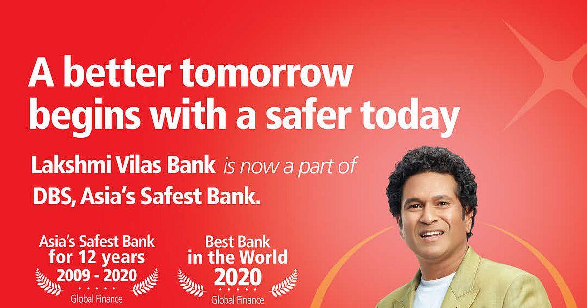 An advertisement banner featuring Sachin Tendulkar, who was roped in by DBS Bank as brand ambassador some five years ago, was also seen with the message: 'A better tomorrow begins with a safer today. Lakshmi Vilas Bank is now part of DBS, Asia's Safest Bank'.