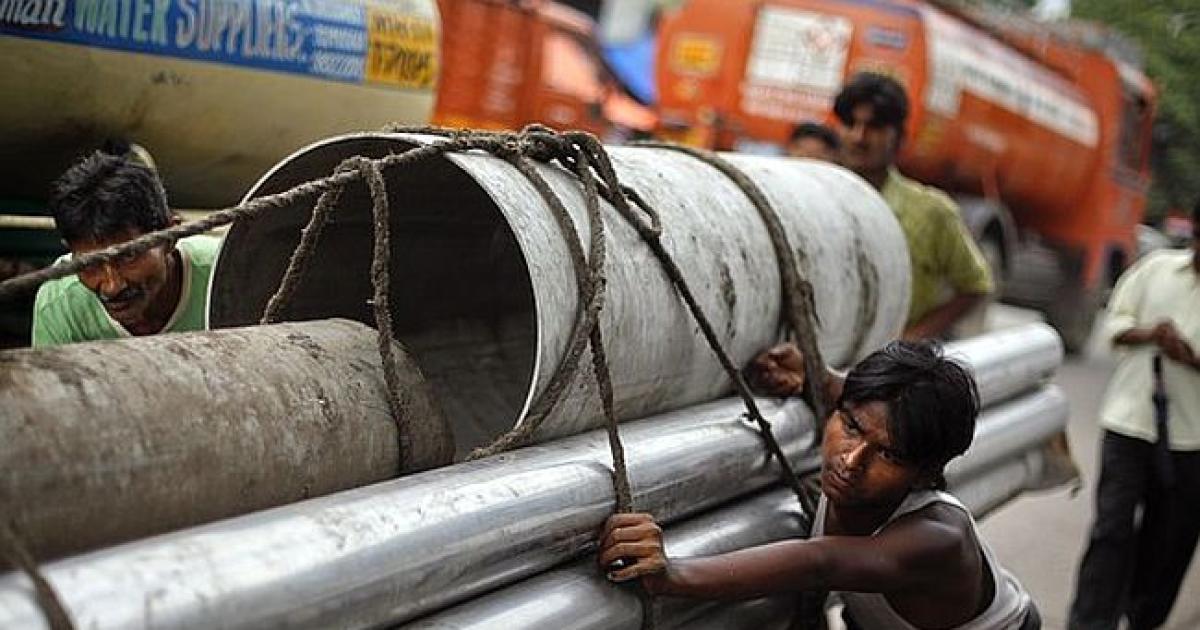 Porters loaded metal pipes on a wooden hand cart in an industrial area in Mumbai. Photograph: Danish Siddiqui/Reuters
