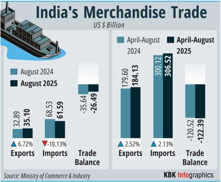 The cumulative exports (merchandise and services) during April-August 2025 is estimated at $349.35 billion, as compared to $329.03 billion in April-August 2024, showing a growth of 6.18 per cent.