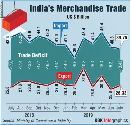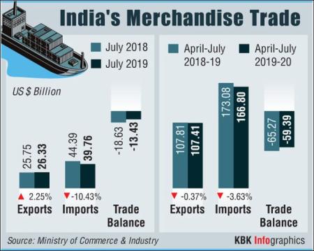 Cumulatively, during April-July 2019, exports dipped 0.37 per cent to $ 107.41 billion, while imports contracted by 3.63 per cent to $ 166.8 billion.