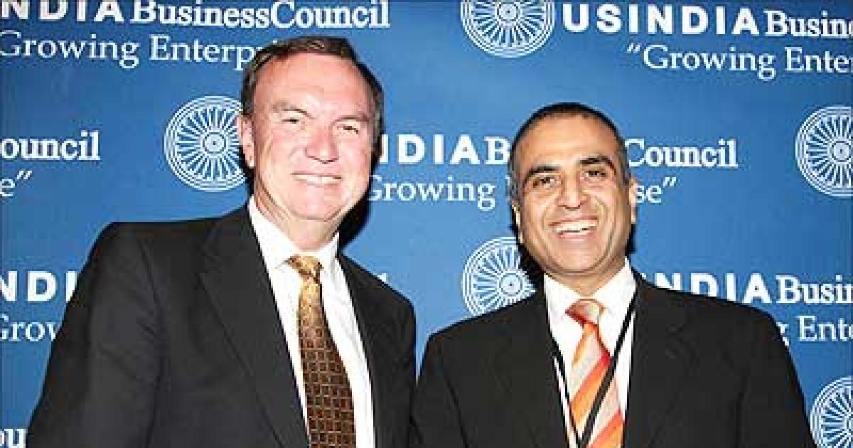 Mike Duke (left), senior vice president, Wal-Mart, and Sunil Bharti Mittal, president CII and chairman & group CEO, Bharti Enterprises, pose for a photo during the US-India Business Council luncheon
