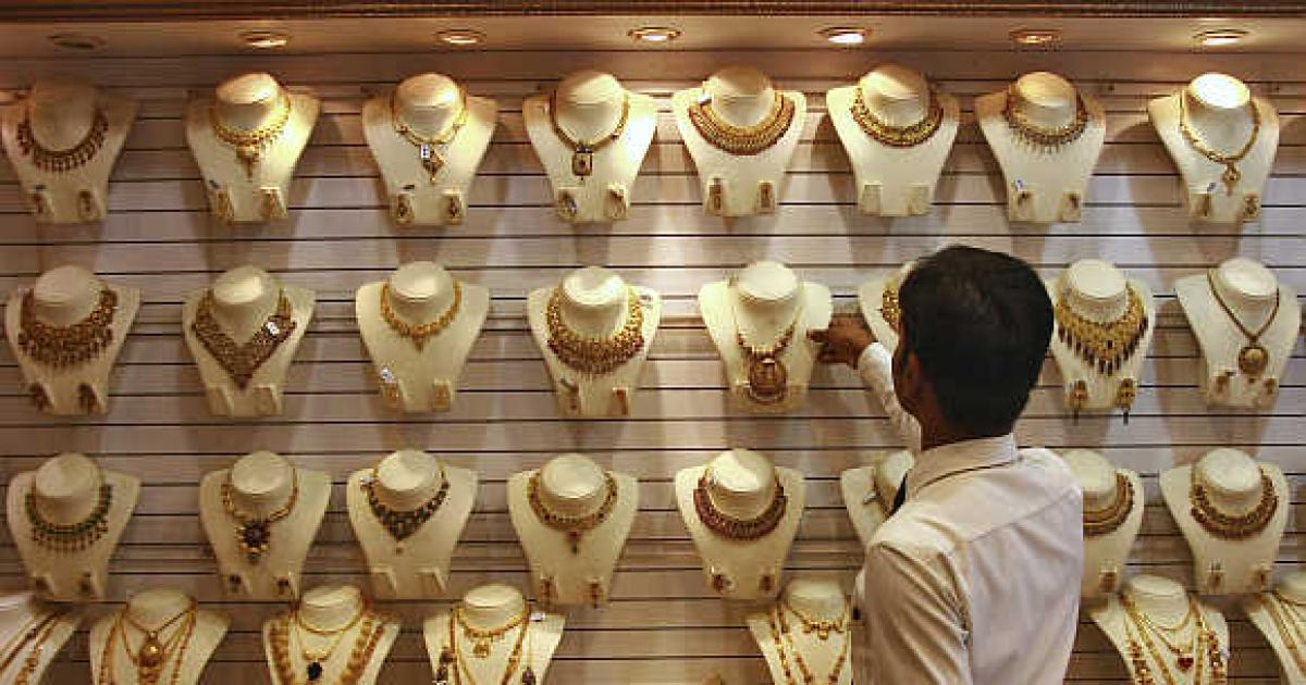 Image: A salesman arranges a gold necklace inside a jewellery showroom in Kochi. Photograph: Sivaram V/Reuters