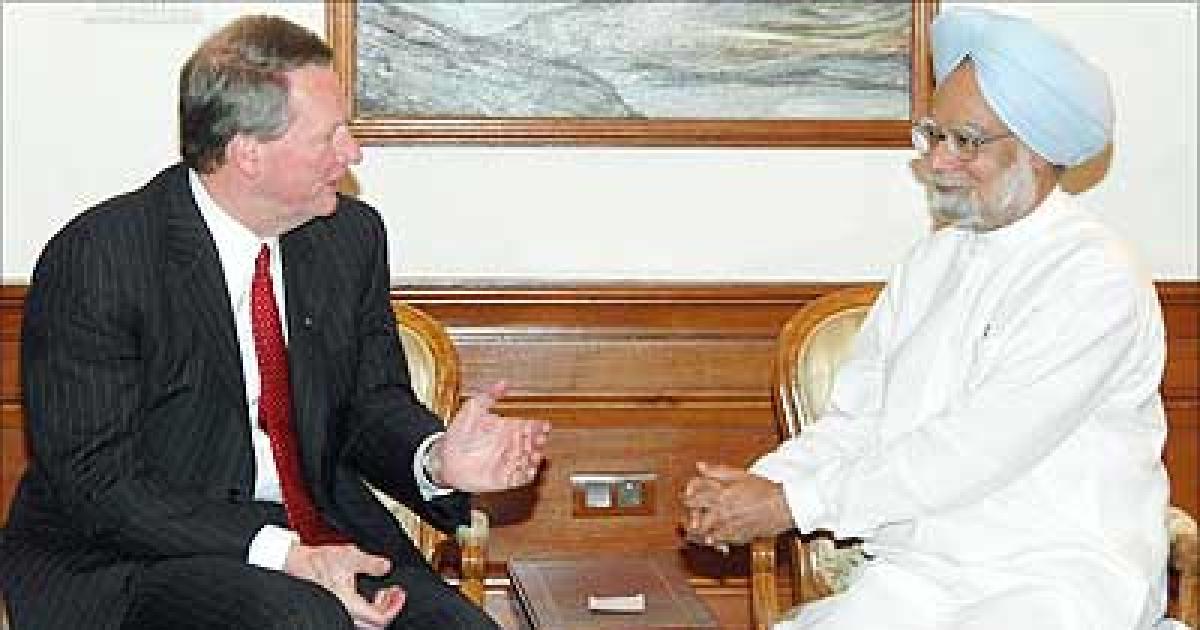 (Above) Rick Wagoner, chairman of General Motors, talks with Prime Minister Manmohan Singh during a meeting in New Delhi on Tuesday.