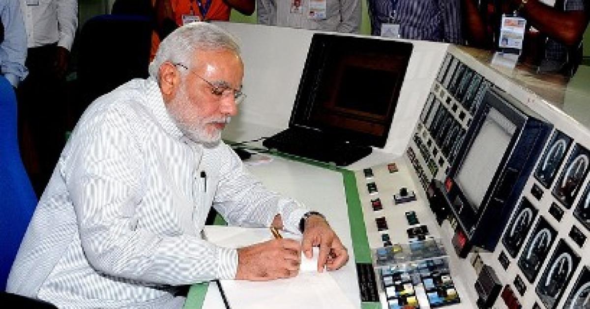 Image: Narendra Modi signing the visitors' book during his visit at the Bhabha Atomic Research Centre Photograph: Press Information Bureau
