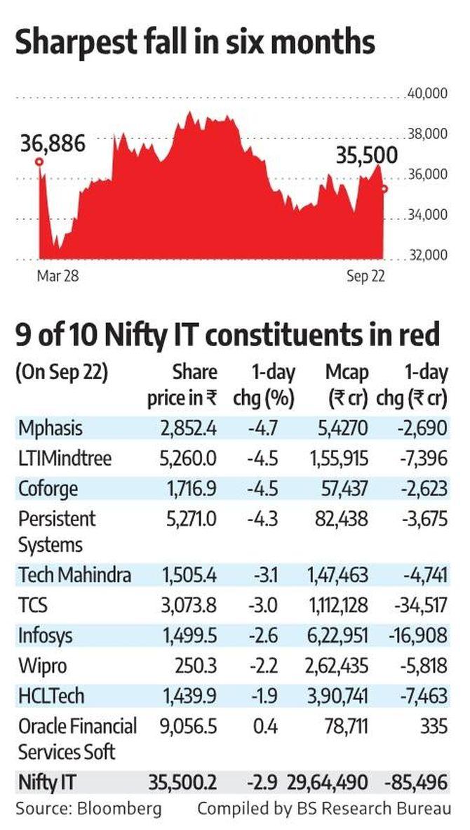 The Nifty IT index closed at 25,550, down 2.95 per cent -- its steepest fall since April 3. Nine of its 10 constituents ended lower, wiping out a combined Rs 85,496 crore (Rs 854,960 billion) in market capitalisation.