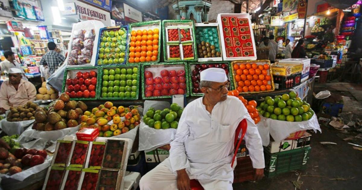 Image: A fruit seller waits for customers at his stall at a wholesale market in Mumbai. Photograph: Vivek Praksh/Reuters