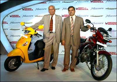 Photograph: Brijmohan Lall(L), chairman, Hero Honda Motors Ltd and Pawan Munjal, managing director pose with 'Pleasure', the first Hero Honda scooter and the 'Achiever' motorcycle.