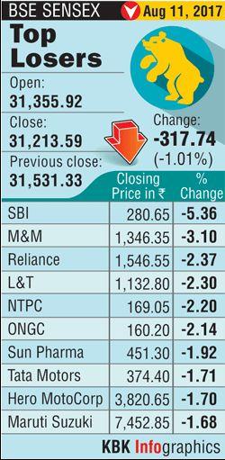 The BSE 30-share Sensex remained in the negative zone and settled down 317.74 points, or 1.01 per cent, at 31,213.59, its weakest closing since July 4. The index had tumbled 794.08 points in the last four sessions.