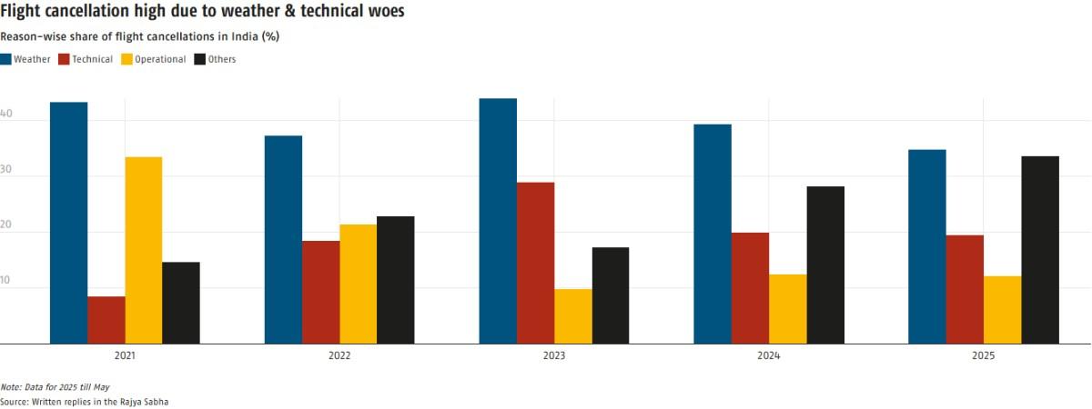 Weather accounts for the highest proportion of flight cancellations, followed by others, such as commercial issues, security concerns and strikes, and technical reasons in recent years. (Chart 1)