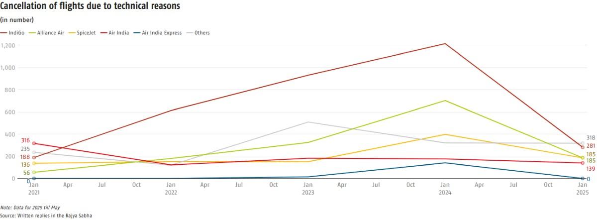 Flight cancellations due to technical reasons have increased across airlines, barring Air India.