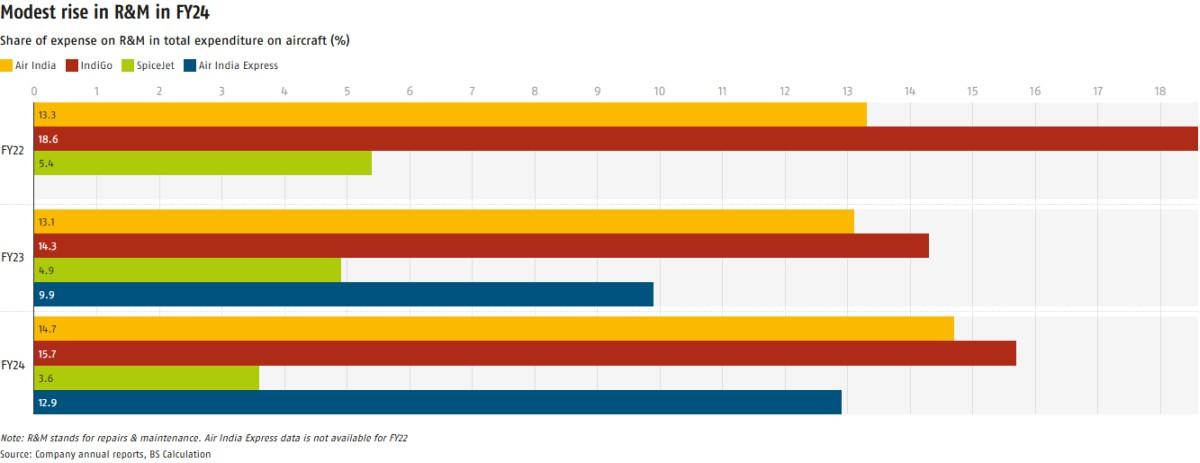 The share of repairs & maintenance expenditure in total airline expenditure has remained modest, though Air India, Air India Express, and SpiceJet have seen an increase in this from FY23 to FY24. (Chart 5)