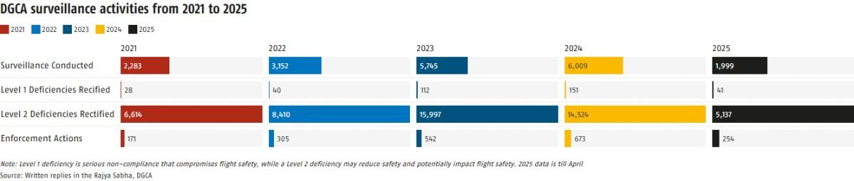 As of April 2025, it stood at 1,999. Enforcement actions by the DGCA increased from 171 in 2021 to 673 in 2024. In 2025, they were 254 as of April. (Chart 6)