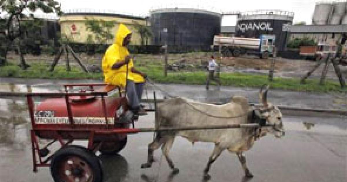 Image: A worker transporting kerosene in a bullock cart travels past Indian Oil Corporation's fuel depot in Mumbai Photograph: Danish Siddiqui/Reuters