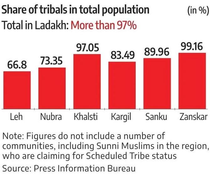 Tribals constitute over 97 per cent of the total population in Ladakh and local leaders are demanding its inclusion in the Schedule Six of the Constitution which gives tribals the right to manage affairs of the region to protect tribal culture, tradition and land.