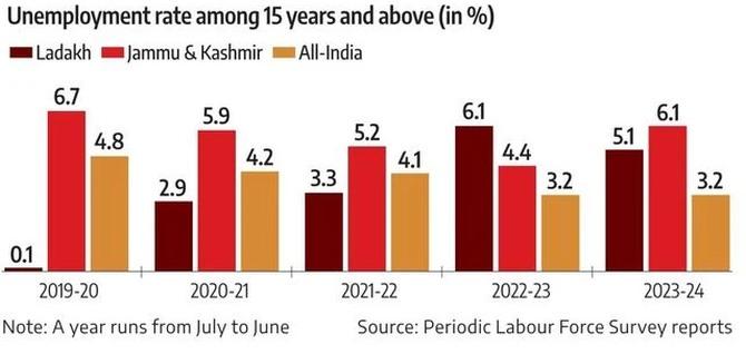 In comparison, the unemployment rate in J&K, another region carved out as UT but with a legislature at the very same time, stood as high as 6.1 per cent in 2023-2024.