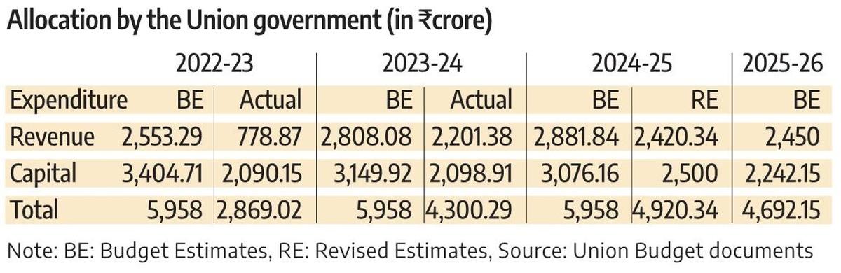 For instance, ₹5,958 crore was allocated for the region in 2024-2025 (budget estimates). However, it was truncated to ₹4,920.34 crore in the revised estimates.