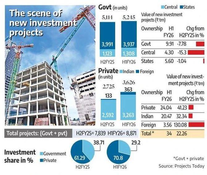 Private investment projects constitute well over 70 per cent of the nearly Rs 34 trillion of fresh investments announced in H1 this year.