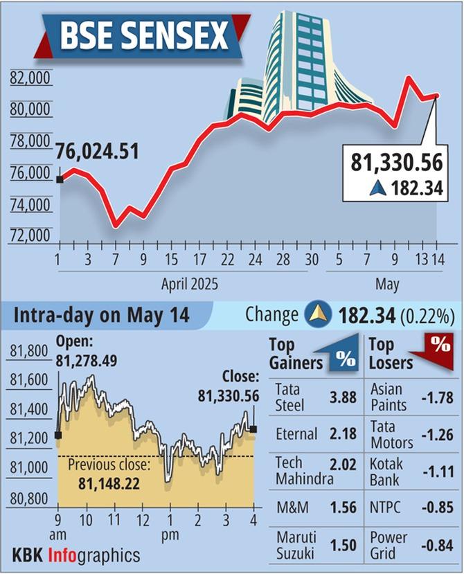 In a highly volatile trade, the 30-share BSE benchmark gauge Sensex climbed 182.34 points or 0.22 per cent to settle at 81,330.56.