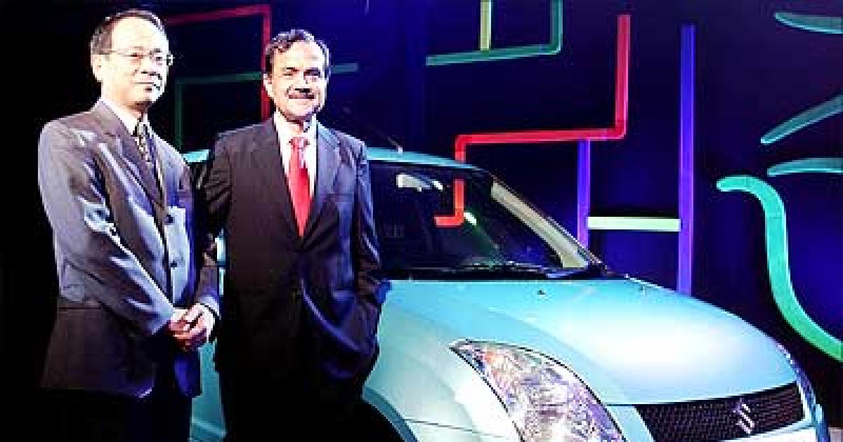 Jagdish Khattar (R) MD, Maruti Udyog and S. Oishi (L), Director (Marketing), Maruti Suzuki, with the newly unveiled Swift Diesel in New Delhi.