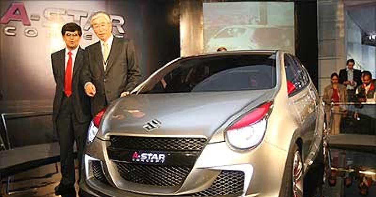 Image: Maruti Suzuki India Ltd managing director S Nakanishi (R) with the A-Star concept car. Photograph: Raveendran/AFP/Getty Images
