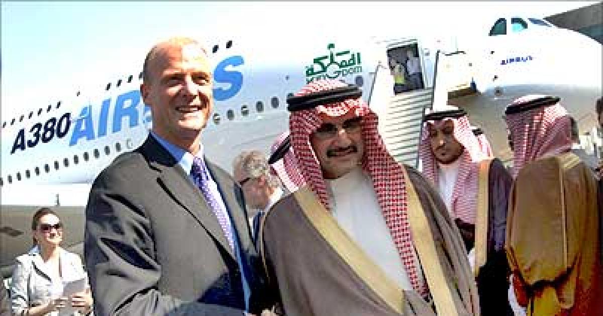 Saudi billionaire Prince Walid bin Talal bin Abdul Aziz with EADS CEO Tom Enders (L) in front of an Airbus A380 during the Dubai Air Show, 2007