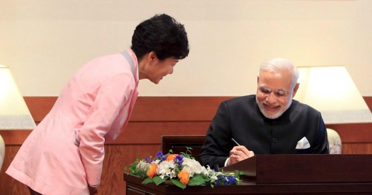 Image: Indian Prime Minister Narendra Modi (R) signs a guestbook with South Korean President Park Geun-Hye after his arrival at the presidential Blue House on May 18, 2015 in Seoul, South Korea.