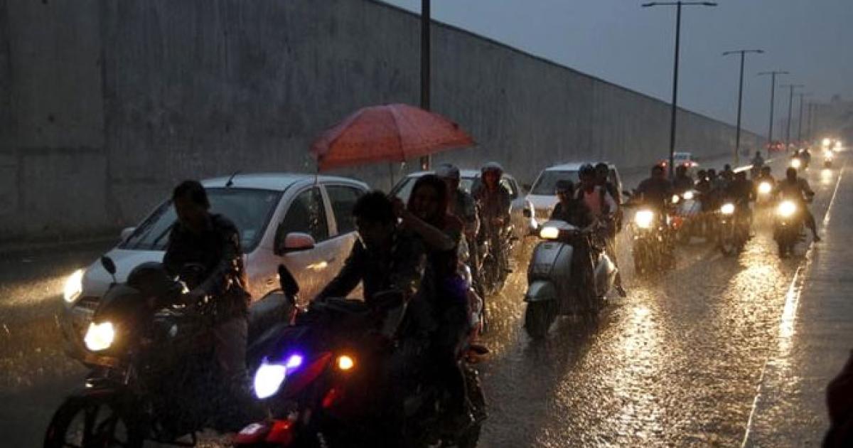 Image: Commuters on their vehicles move through an underpass during a heavy shower in Ahmedabad. Photograph: Amit Dave/Reuters