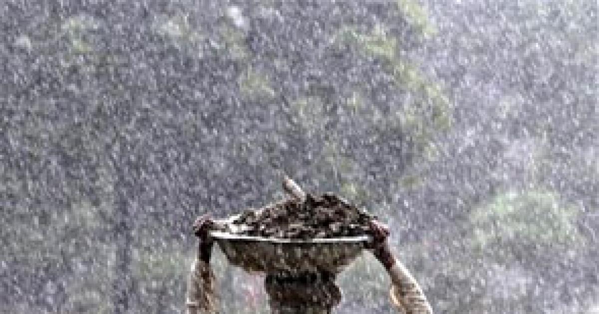 Image: A labourer carries a container of mud while working on a roadside as it rains in Noida. | Photograph: Parivartan Sharma/Reuters