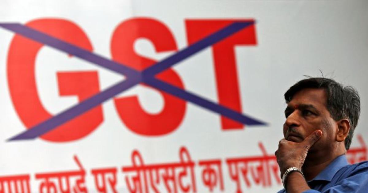 Image: A man walks past a banner during a protest against the implementation of GST. Photograph: Adnan Abidi/Reuters