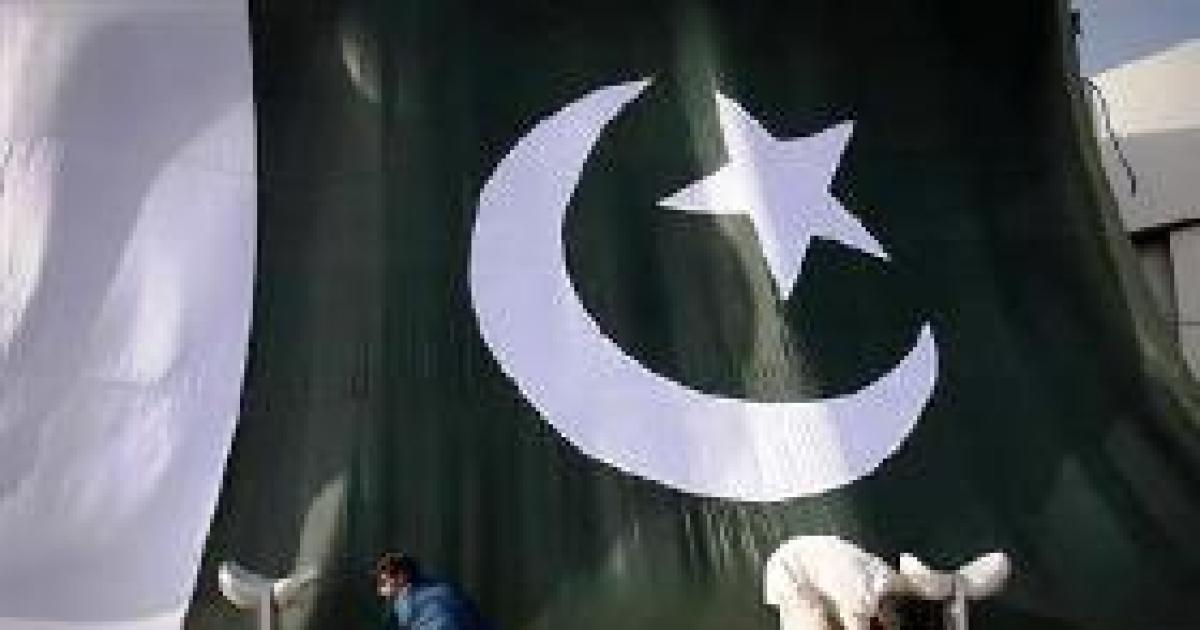 Image: Labourers drape a large Pakistan flag outside a cinema in Karachi | Photograph: Athar Hussain/Files/Reuters