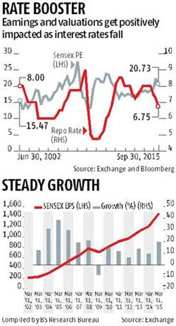 But, the stage is not yet set for expansion in valuations. Currently, the state of the economy is feeble even as it is growing at the fastest pace in the world. Compared to the 2001 and 2005 (end) period when the interest rate cycle moved south remained benign for some time, corporate India delivered strong earnings growth and the market PE surged from a low of 12.6 times to over 25 times (see chart), though with some lag. So, there was a multiplier effect of earnings growth and valuation expansion. Data show when the repo rate is at or above eight per cent, valuations seem to take a hit, whereas when repo rate is around six per cent, valuations look up.