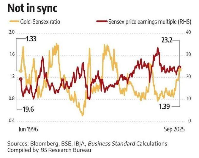 In the same period, the ratio of gold to the Sensex is up nearly 80 per cent in the last four years -- from 0.77 in September 2021 to 1.37 on September 24, 2025.