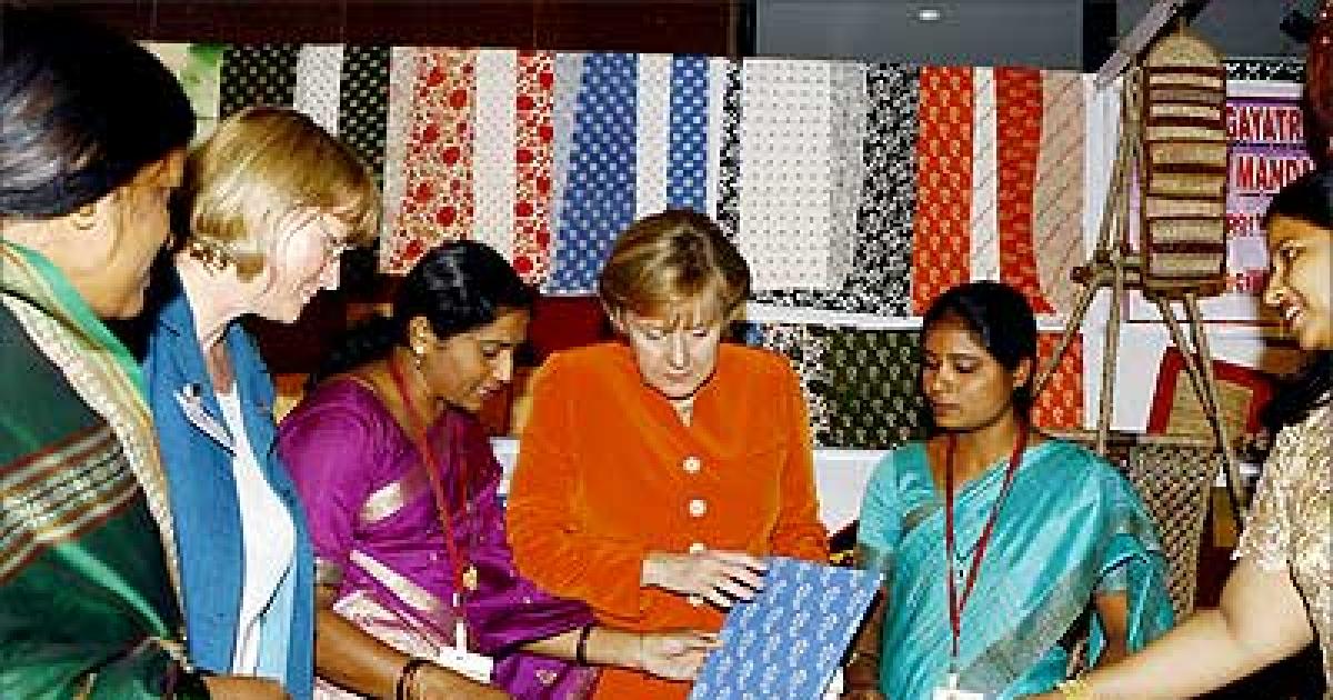 German Chancellor Angela Merkel (centre) goes through Indian fabric made by self help groups at the head office of National Bank for Agriculture and Rural Development in Mumbai on Wednesday. Merkel arrived in India for a visit expected to focus on security and trade issues, as Europe's largest economy aims to strengthen ties with the Asian giant.