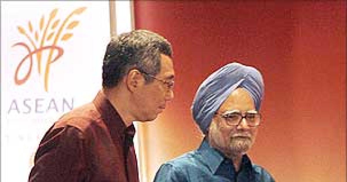 Prime Minister Manmohan Singh (right) speaks to Singapore's Prime Minister Lee Hsien Loong before a gala dinner during the 13th Association of Southeast Asian Nations Summit in Singapore on November 20.