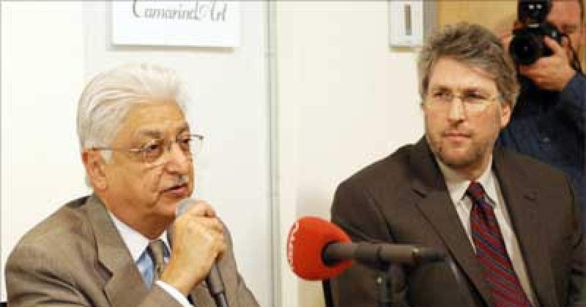 (Above) Wipro Chairman Azim Premji and author of Bangalore Tiger Steve Hamm (right) at a reception hosted by the South Asian Journalists Association and the Tamarind Art Gallery in Manhattan, New York.