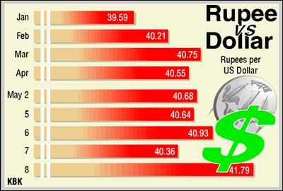 The rupee resumed sharply lower at 41.59/60 a dollar from its last close of 41.35/36 a dollar. The rupee is hitting this level for the first time since April 20 2007 when it closed at 41.76/77 per dollar.