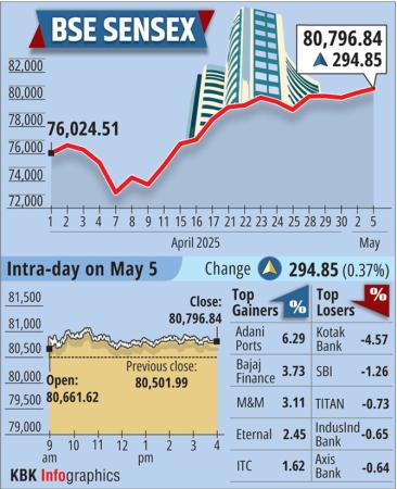 The 30-share BSE benchmark climbed 294.85 points or 0.37 per cent to settle at 80,796.84, extending its previous day's rally.