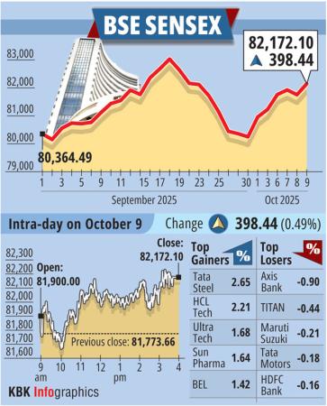 The 30-share BSE Sensex climbed 398.44 points or 0.49 per cent to settle at 82,172.10.