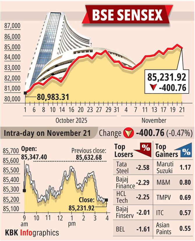 The 30-share BSE Sensex declined 400.76 points or 0.47 per cent to settle at 85,231.92.