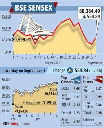 The 30-share Sensex jumped 554.84 points or 0.70 per cent to settle at 80,364.49 with 23 of its constituents ending higher and seven lower.