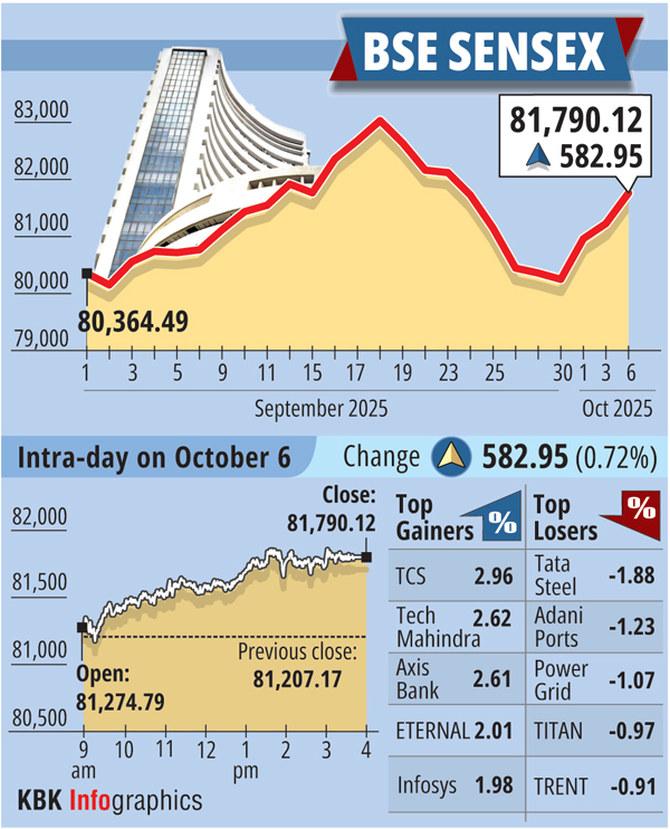 The 30-share BSE Sensex jumped 582.95 points or 0.72 per cent to settle at 81,790.12.