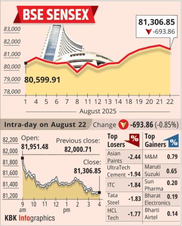 The 30-share BSE Sensex tumbled 693.86 points or 0.85 per cent to settle at 81,306.85.