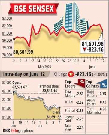 Prashanth Tapse, Senior VP (Research), Mehta Equities Ltd, said, "A host of factors triggered a massive slump in local benchmarks, as investors exited stocks at will weighed down by weak global sentiment coupled with the possibility of Israel attacking Iran and renewed tariff threat by US President Donald Trump."