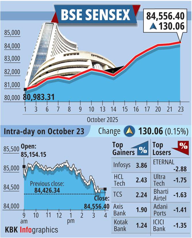 The 30-share BSE Sensex climbed 130.06 points or 0.15 per cent to settle at 84,556.40.